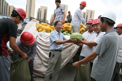 連日來,銀川驕陽似火,酷暑難耐。為了切實維護廣大員工的身體健康,營造健康、安全、和諧的工作環境,7月19日,寧夏鼎城房地產開發有限公司工會專門準備了壓砂西瓜、甜瓜,開展了“酷暑送清涼”活動,在為本單位職工送去夏日清涼的同時,還為施工單位寧夏對外建設總公司、監理單位銀川方圓工程咨詢有限公司、物業單位銀川市銀川市敦睦物業服務有限公司的廣大員工也送去了鼎城的慰問和關愛。(張莉)