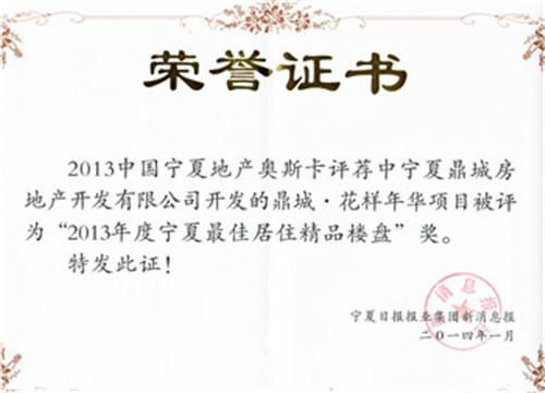 “2013年度寧夏最佳居住精品樓盤”榮譽證書